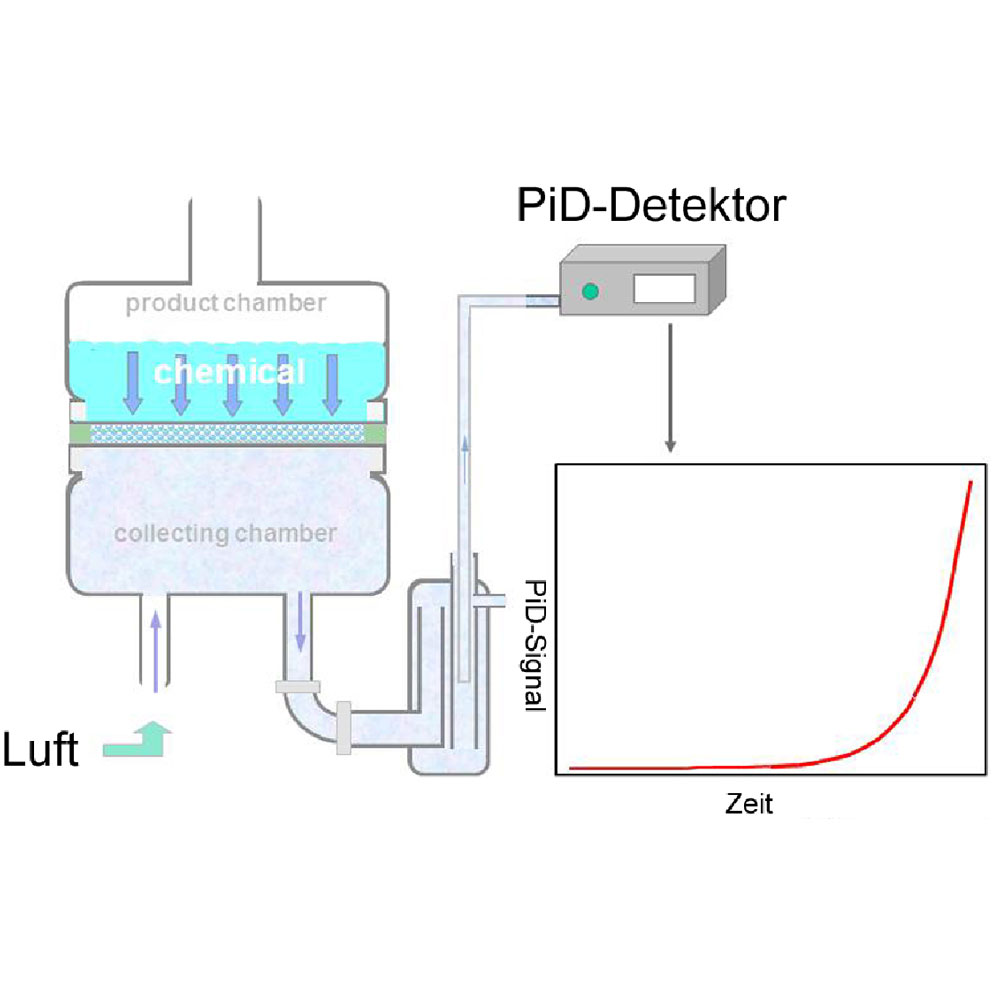 Mobiler Permeationsprüfstand (PERMOBIL) ist gemäß den Normen EN374, EN 6529, EN16523-1, EN16523-2 unter Verwendung eines des PID (PID = Photoionisationsdetektor) in Kooperation mit dem IFA (Institut für Arbeitsschutz) entwickelt. Das PERMOBIL dient der Prüfung bei 23°C (±1°C) von Folien wie zum Beispiel Schutzhandschuhen oder Schutzanzügen auf deren Durchlässigkeit für mit einem PID-Detektor erkennbaren flüchtigen organischen Verbindungen. Das PERMOBIL-System besteht aus einer Permeationszelle aus Glas, die in den Normen EN374, EN629, EN6529 und EN16523 beschrieben ist. Auf die zu prüfende Folie wirkt einseitig die zu untersuchende Flüssigkeit ein. Die entgegengesetzte Seite wird mit einem definierten Luftstrom angeströmt. Der abgehende Luftstrom (gasförmiges Sammelmedium, offener Kreislauf) wird mit dem PID Handmessgerät ALTAIR ® 5X aus einem Luft-Ausgleichsglasgefäß angesaugt und in Abhängigkeit der Zeit analysiert.