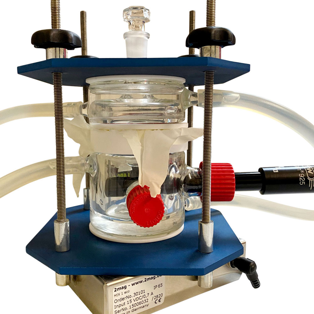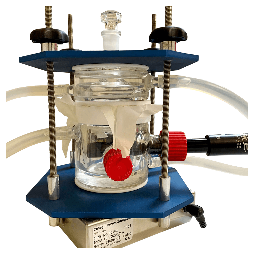Im unteren Bereich der Zelle wird in der Regel deionisiertes Wasser als Sammelmedium verwendet. „Closed Loop“ heißt, dass in einem geschlossenen Kreislauf getestet wird. Das deionisierte Wasser bleibt den ganzen Prüfzyklus in der Zelle und wird am Ende des Permeationsversuchs entsorgt. Vorteilhaft beim „Closed Loop“ ist, dass Ressourcen gespart werden. Das Sammelmedium wird für den gesamten Versuch genutzt, beim offenen Kreislauf oder „open Loop“ wird es in die Zelle geleitet und auf der anderen Seite abgeleitet. Zellen mit „Open Loop“ sind als Anhänge der Norm skizziert, bieten aber keine Vorteile. Das Sammelmedium wird kontinuierlich bewegt um sicherzustellen, dass im Sammelmedium eine konstante Konzentration und Temperaturverteilung herrscht. Abgestimmt auf das Stativ der Permeationszelle wird ein 2MAG Magnetrührer mitgeliefert, er passt genau unter die Zelle sodass mittels Magnetrührerstäbchen gerührt werden kann. Im Vergleich zu anderen Beispielzellen in den relevanten Normen wird bei der Fluid-PermCell NW50-liquid das Sammelmedium nicht in einem geschlossenen Kreislauf gepumpt oder von außen mit einem Rührwerk bewegt. Dadurch wird die Permeationszelle wesentlich kompakter und kann leicht an unterschiedlichen Plätzen im Labor aufgebaut werden.